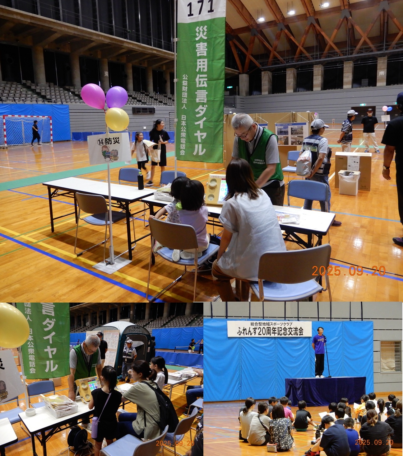 令和7年9月20日(土)富山支部は氷見市ふれあいスポーツセンターで開催された「ふれんず20周年記念交流会」に参加し、災害用伝言ダイヤル171体験機を活用したPR活動を行うとともに、「災害用伝言ダイヤル171」チラシ・ティッシュ等を配布しました。