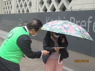 役員会に先立って、会場前の県庁通りで開かれている「木曜市」周辺で、買い物に来られた方に171周知用ツール(ポケットティッシュ・マスク)を配布し、171の周知活動を行いました。