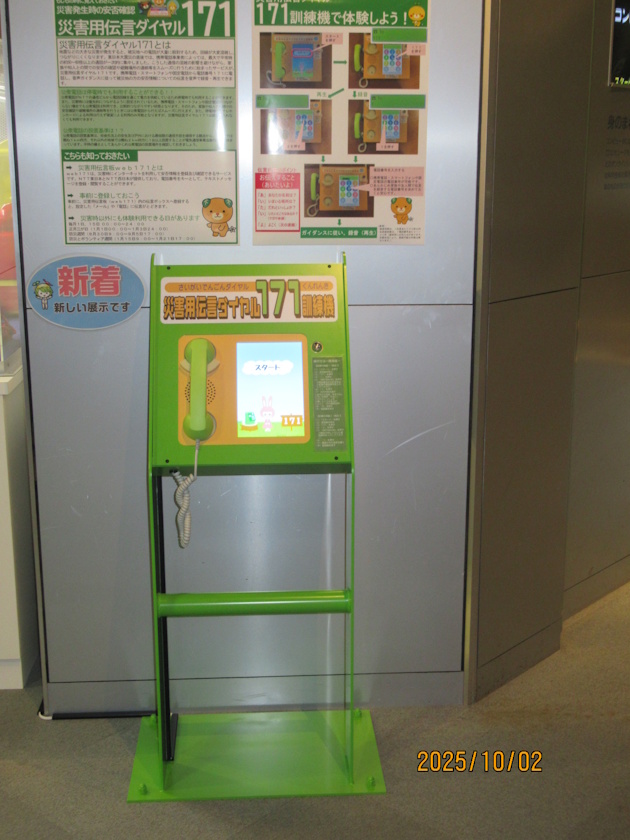 愛媛支部では、10月2日(木)四国の新たな取り組みによる間接周知活動において、愛媛県総合科学博物館内に常設展示コーナ-が開設されました。171体験コーナを開設して、新規活動形態の展開に向け、災害用伝言ダイヤル171の啓発活動への事前対応に取り組みました。当日は、災害用伝言ダイヤル171周知啓発ツール(マスク、ポケットティッシュ)を持参して、開設コーナーに機器展示に配備をいただける設置場所等の確認等を実施しました。