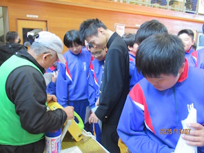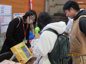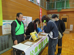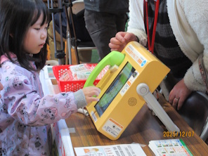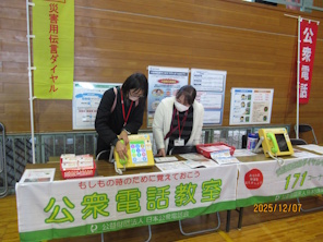 この学習は、各学年ごとに実施する訓練に基づいて実施しました。2年生は、避難所訓練として、避難所開設作業、受付、誘導や防災士と簡易トイレを段ボールで手づくりトイレを作成してトイレ問題のディスカッションを実施したり、3年生は、救急救護訓練として、各講座ごとに3班に分かれて30分毎に、ローテーションをおこない防災ビデオ講座・徒手搬送・応急処置実技訓練・AED及び心肺蘇生実技訓練を実施しました。まず、防災意識を高め災害に備えることや災害の時に自主的に行動し、周囲の人と協力して助け合う力を育てることを目的に、防災学習参観日として実施しました。当ブースの災害用伝言ダイヤルのコーナーにも、PTAの役員さんの協力をいただき、171の体験説明を実施しました。特に馬越防災士による「ユレタ体験」は、生徒の皆さん真剣に体験をされていました。