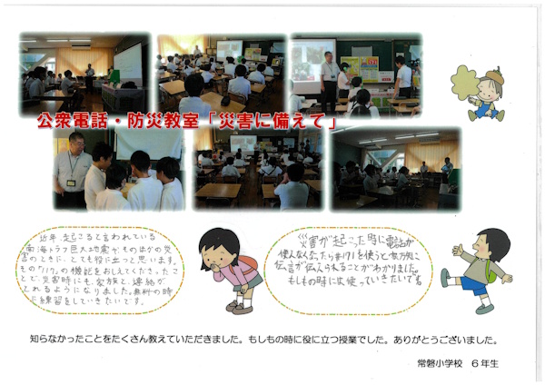香川支部では、香川県観音寺市立常盤小学校で6年生を対象に公衆電話・防災教室「災害に備えて」防災学習の一環として、公衆電話や災害用伝言ダイヤル171の体験学習による災害時の連絡方法(安否確認)の授業を行いました。10月30日にその時の御礼のメッセージを送っていただきました。