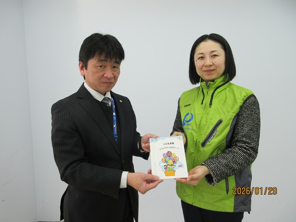 茨城支部では、令和8年1月29日(木)に内田監事から神栖市教育委員会へ「こども手帳」と子ども向け災害用伝言ダイヤルサービス(171)のリーフレット830セットを贈呈。同教育委員会の浅沼教育指導課長から「近年、SNS等でのトラブルが増えており、この手帳を通じて児童の安心・安全に役立てていきたい」とお礼のお言葉をいただきました。