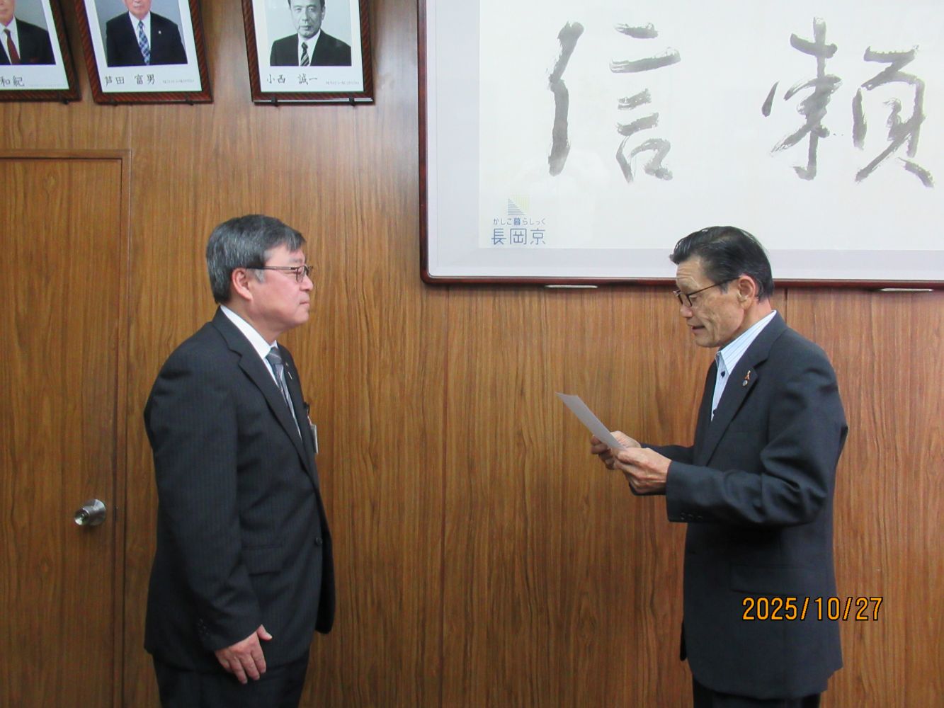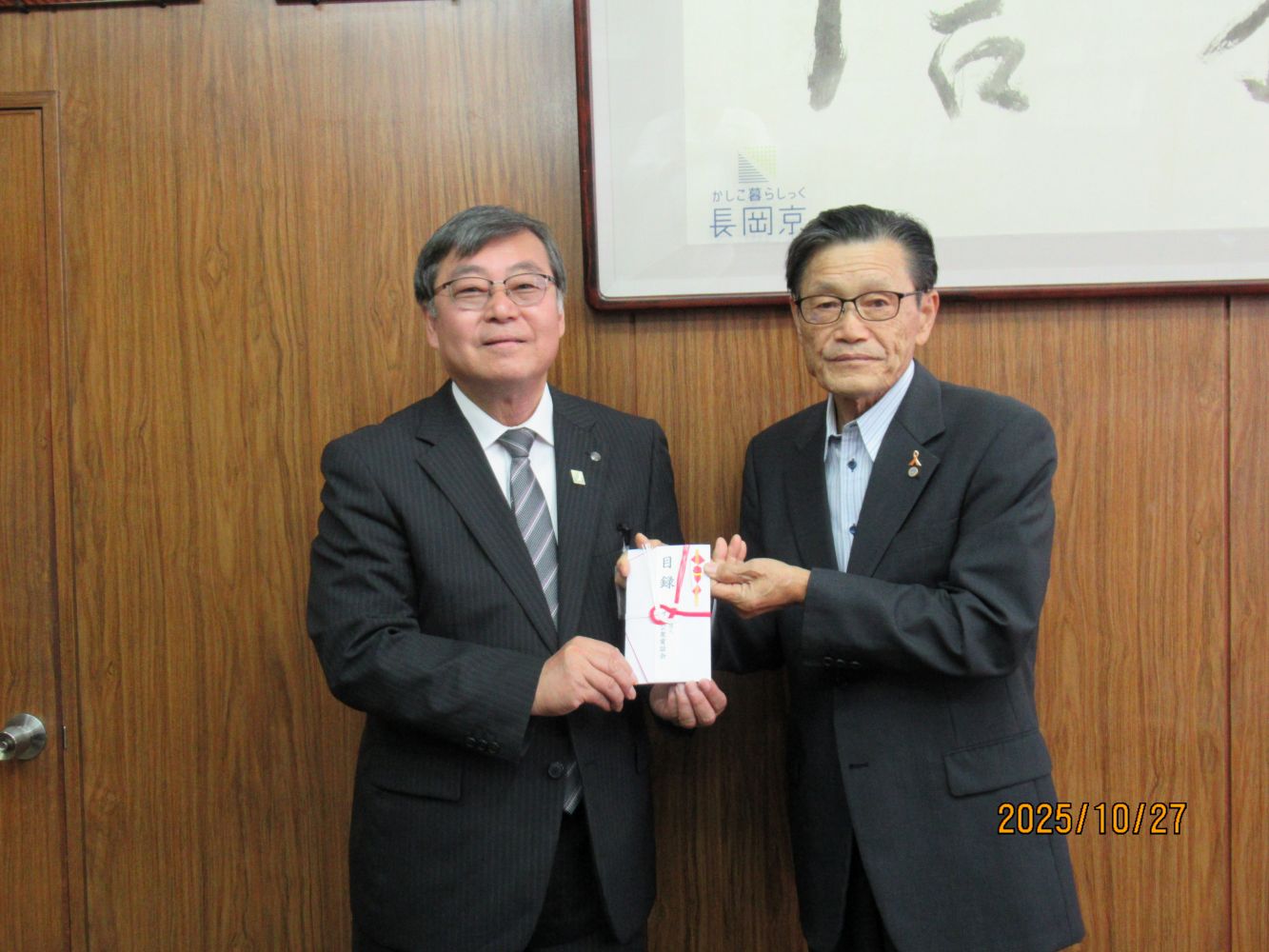 当日は、西村 長岡京市教育長と日本公衆電話会京都支部 宮田相談役との贈呈式を開催し、西村教育長から謝意をいただきました。また、当会が取り組んでいる「公衆電話教室」や避難場所となっている小・中学校の災害時用公衆電話の点検、併せて災害用伝言ダイヤル171の活用などの周知・啓発活動などについて情報共有を行いました。
