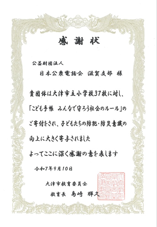 滋賀支部では、令和7年9月10日(水)に昨年度に引き続き山﨑支部長より大津市教育委員会の島崎 輝久教育長に「子供手帳(2,954冊)」を贈呈しました。次年度以降の「こども手帳(電子Book)」への切り替えや大津市立の小学校(37校)における「公衆電話教室」の開催等に向けたご理解・ご協力について改めてご依頼させていただきました。最後に島崎教育長より山﨑支部長に『感謝状』が贈られました。