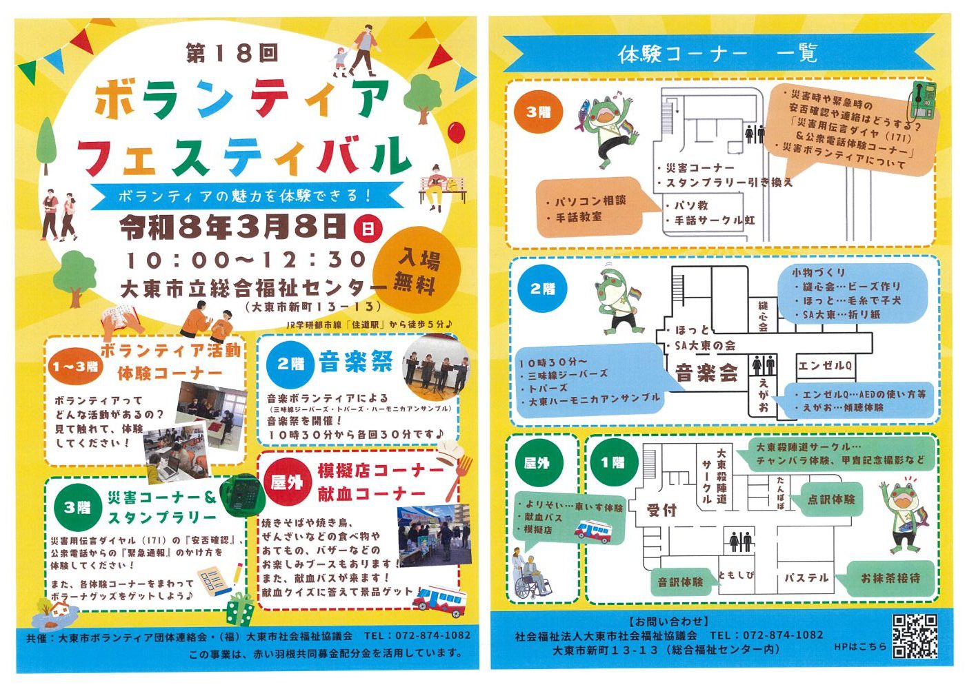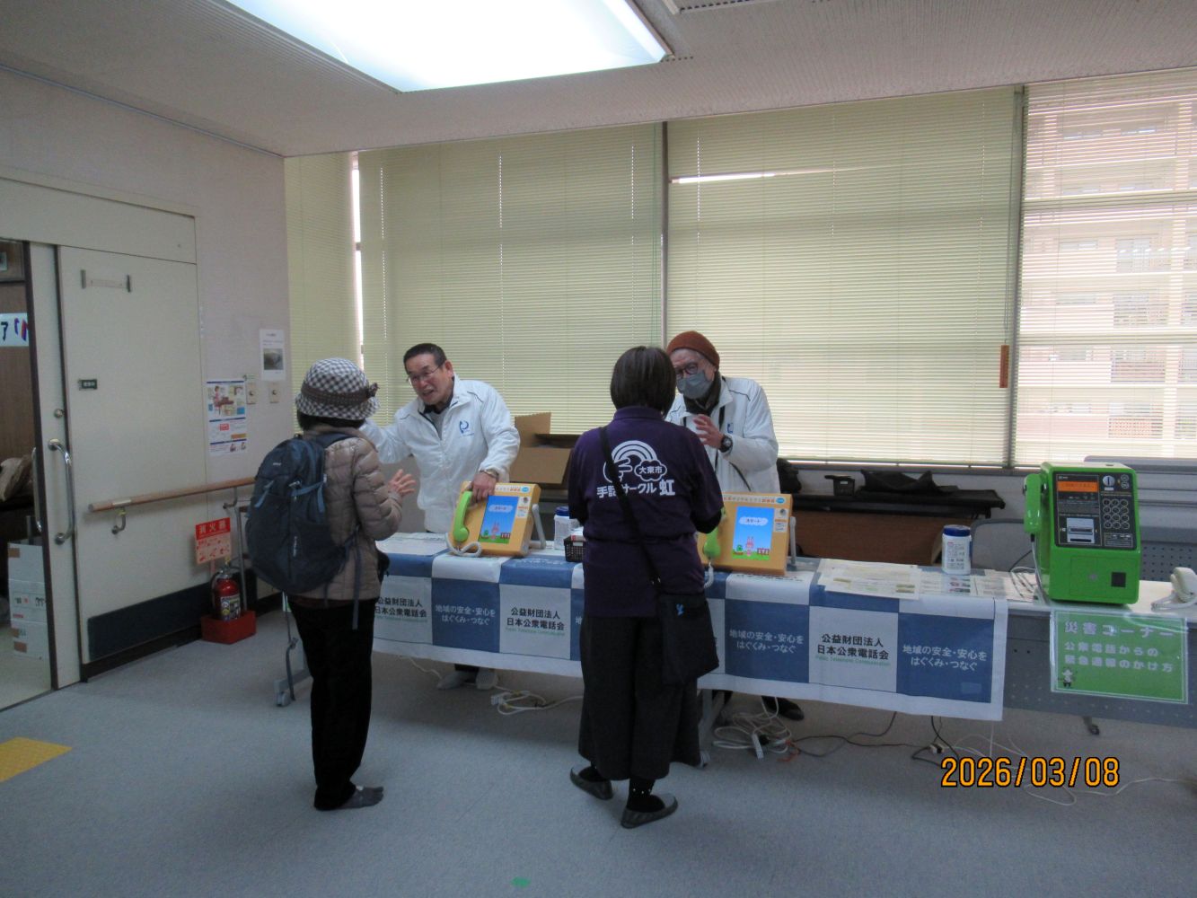 大阪支部では、3月8日(日)、大東市社会福祉協議会が開催する「ボランティアフェスティバル」へ参加し、災害用伝言ダイヤル(171)・公衆電話のデモ機を展示、フェスティバル参加者へ利用体験や171周知を実施しました。