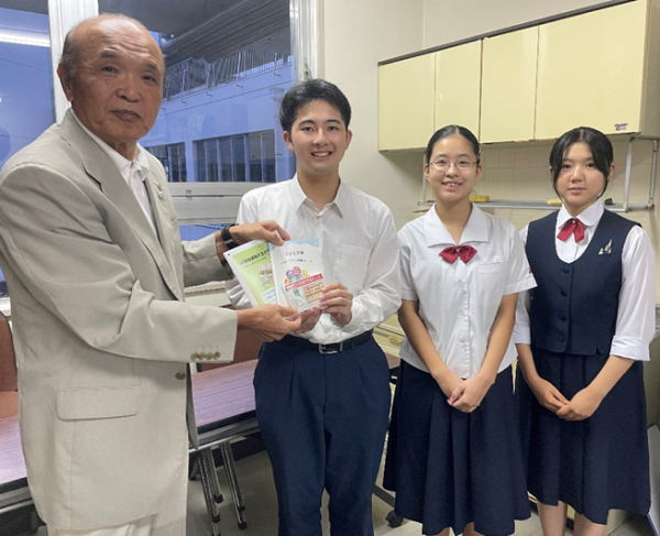 宮崎支部(支部長:岩切 重雄)は、令和7年10月21日(火)に、宮崎県立宮崎北高等学校より、当財団活動内についてインタビューを受けていただきたいと要請があり訪問し受けた際、活動の一環として災害時連絡方法のてびき贈呈を行い災害用伝言ダイヤル171周知活動・および参考にこども手帳贈呈を実施しました。「大事に使わせていただきます。ありがとうございます。」と感謝の言葉をいただきました。