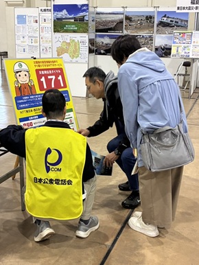 「札幌産業交流フェア」における災害時の安否確認啓発活動の実施 2026/04/15 2026年 北海道 各支部の活動 災害用伝言ダイヤル171等周知活動レポート 北海道統括支部では、4月15日(水)、16日(木)の2日間、アクセスサッポロで開催された「札幌産業交流フェア」において、災害用伝言ダイヤル171の利用体験を通じて防災に対する意識向上啓発活動を実施しました。