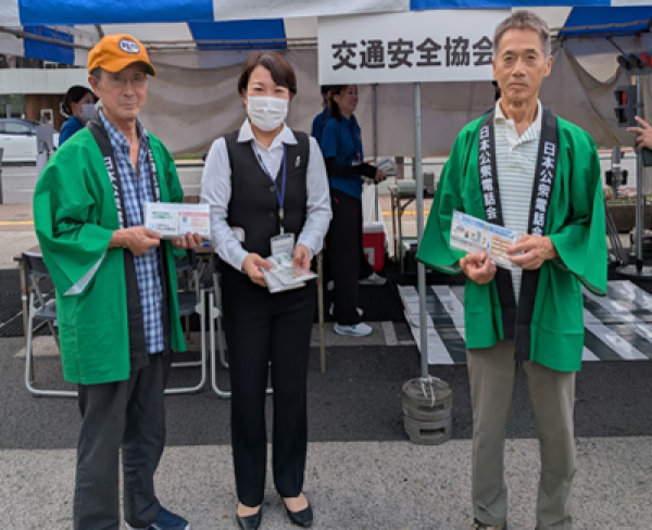 大分支部(支部長:荒金 一義)は、令和7年9月20日(土)に、大分祝祭の広場の大分県交通安全協会を訪問して、地域の安心・安全の取り組みの一環として、災害伝言ダイヤル171周知活動を実施しました。 「大分県交通安全協会」に対し、「災害用伝言ダイヤル(171)」の利用方法を解説した「災害時連絡方法のてびき」ならびにマスク、ティッシュを寄贈しました。大分県交通安全協会の後藤事務局長からは、「ご寄贈いただいた多くのマスクなどは、災害対策の一環として大事に使わせていただきます。ありがとうございます。」と感謝の言葉をいただきました。