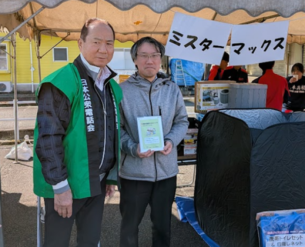 熊本支部(支部長:村上 正誠)は、令和8年1月16日(金)に、山鹿市防災の集いに参加された「ミスターマックス(Mr.Max)」に対し、地域の安心・安全の取り組みの一環として、災害伝言ダイヤル171周知活動を実施しました。 また、「ミスターマックス(Mr.Max)」に対し、「災害用伝言ダイヤル(171)」の利用方法を解説した「災害時連絡方法のてびき」ならびにマスク、ティッシュを寄贈しました。ミスターマックス(Mr.Max)の事務担当からは、「ご寄贈いただいた多くのマスクなどは、災害対策の一環として大事に使わせていただきます。ありがとうございます。」と感謝の言葉をいただきました。