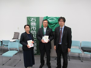 10月16日(水)、日公会宮城支部は石巻市防災士協議会へ安心・安全の確保に役立てるよう「災害時連絡方法のてびき」ならびに「171PRツール」を贈呈いたしました。