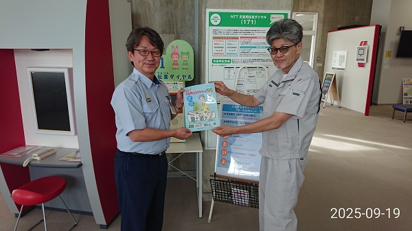 山形市市民防災センターに171クリアファイルを贈呈 2025/09/19 2025年 各支部の活動 東北 災害用伝言ダイヤル171等周知活動レポート 9月19日(金)、山形支部では山形市市民防災センターに、171クリアファイル2,000枚を寄贈しました。これは5月28日の「災害用伝言ダイヤル171普及セット(ポケットマニュアル)」「災害時連絡方法のてびき」の寄贈に引き続き、山形市市民防災センターに設置した171体験ブース(171訓練機)活用の更なる進展が図られるよう実施したもので、センターでは今後来場者に広く配布し、活用の推進を図る予定です。