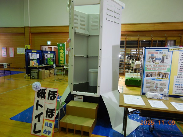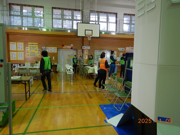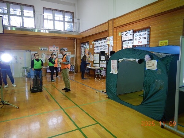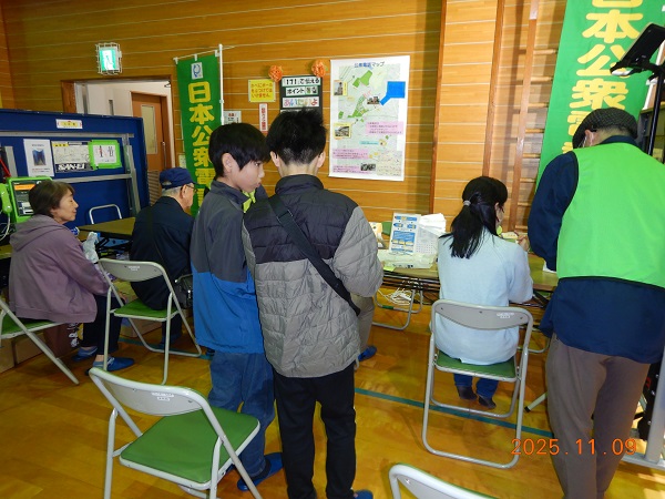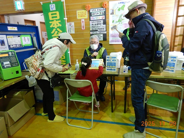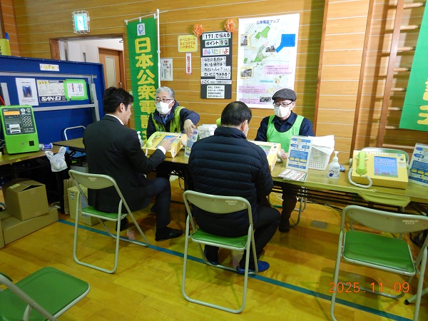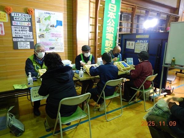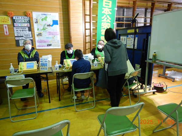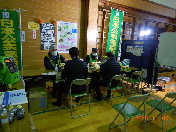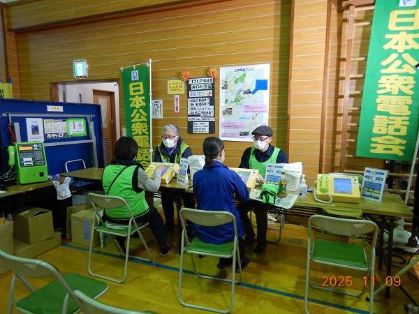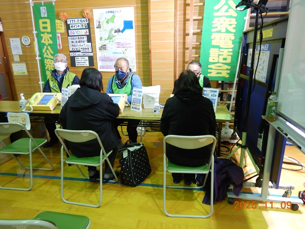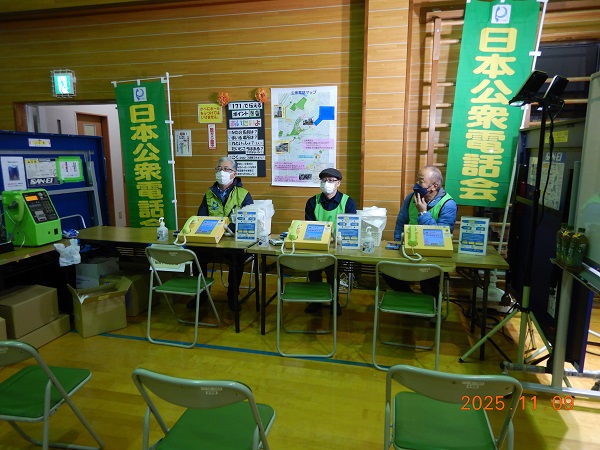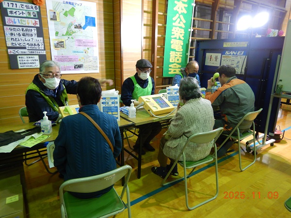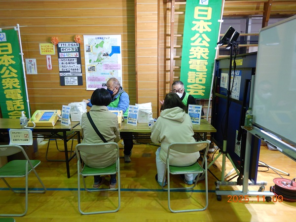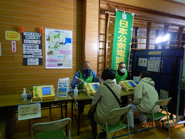 令和7年11月9日(日)、グリーンハイツ八千代(マンション)にて防災イベントが行われ、千葉支部では「公衆電話および171体験教室」のメニューでイベントへ参加しました。600世帯を超える大規模マンションで、毎年テーマを決めて様々な防災メニューをブース形式で準備し、住民の方に体験いただくことで発災時の基本行動を確認していただく工夫を盛り込まれています。今年はマンション自治会で、組み立て式個室トイレを購入され、実際に組み立て設置し、体験試用を実施しされました。171については災害時の連絡ツールとしての重要性を理解いただき、毎年体験教室開催のご要望をいただいていております。今回「公衆電話および171体験教室」では日本公衆電話会事務局2名、グリーンハイツ八千代自治会から3名の支援をいただき、合計5名の体制で公衆電話体験機1台、171体験機3台を使用し体験教室を実施しました。来場者された住民の方々は、防災に対する意識が高く171サービスもご存じだったため、デモ機による体験もスムーズに行うことができ、約100名の方が公衆電話機と171体験機を体験されました。参加者からは、「毎月1日、15日のNTTサービス開放日には、家族で体験してみる。」「WEB171との連携が体験できてとても勉強になった。」等のお言葉もいただきました。