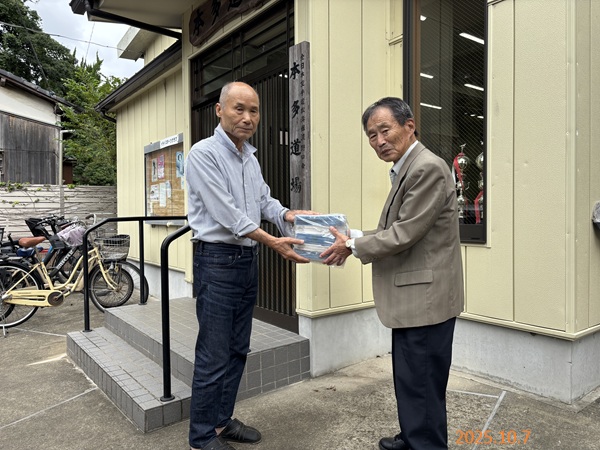 神奈川支部では、10月7日(火)、全日本空手道場松濤館野口会本多道場(川崎市高津区)にて、地域の安全・安心への貢献活動として、川野支部長より本多会長(空手八段)へ171周知用マスクとティッシュを贈呈しました。道場で稽古される方々やそのご家族へ配布することにより、災害時伝言ダイヤル171の周知を行うこととしました。