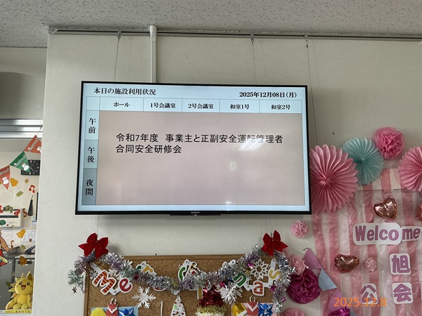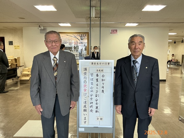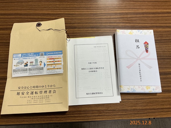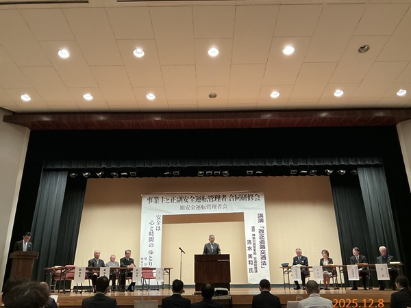 神奈川支部では、12月8日(月)、神奈川県横浜市にて開催された「令和7年度事業主と制服安全管理者合同研修会」にて、神奈川県警旭警察署、旭安全運転管理者会と協働して災害用伝言ダイヤル171の周知を実施しました。本総会は、約100名の方が参加されました。来賓で来られた小林神奈川県警旭警察署長、権藤旭区長や参加者のみなさまに対し、当会の取り組みなどの紹介もさせていただきました。小林所長や権藤区長からは市民の安心安全の取り組みへの協力について御礼をいただきました。
