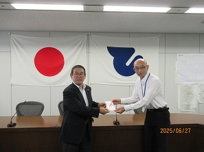 大阪支部では、令和7年6月27日(金)に桑田副支部長から東大阪市危機管理室の田島室長に令和7年度における「災害用伝言ダイヤルサービス(171)」の周知・PR活動用に「マスク」「ティッシュ」を各2,000個贈呈しました。東大阪市においては、昨年度から、「安全・安心まちづくりコンサートin東大阪」等の機会を通じて、市内「在住」「在勤」「在学」のみなさんに対して積極的なPR活動に取り組んでいただいていることから引き続き贈呈させていただきました。