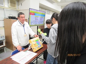 兵庫支部では、令和8年1月17日(土)に神戸市立長田南小学校の「長田南1.17のつどい」に参加して「171・公衆電話教室」を実施しました。各学年ごとに「防災チャレンジ」ということで各種の防災訓練(1年生は避難リュック作り、2年生は新聞スリッパ作り、3年生は紙食器作り、4・5年生は水消火器体験・毛布担架体験・煙体験・視覚聴覚体験・給水体験、6年生は心肺蘇生法・通報訓練)に取り組んでおられました。今回の防災チャレンジには8団体40名以上の方々が協力して実施されました。当会の取り組みに参加した6年生2クラス約40名には災害用伝言ダイヤル171・公衆電話の使い方についてを体験してもらいました。「普段使ったことがない公衆電話を使っての体験、また、もしもの時に使う伝言ダイヤルを使っての通報訓練は大変有意義な時間になりました」とのコメントをいただきました。また、実施前に高木教頭先生に「こども手帳」を贈呈するとともに災害用伝言ダイヤル171のポスターの掲示をお願いしました。