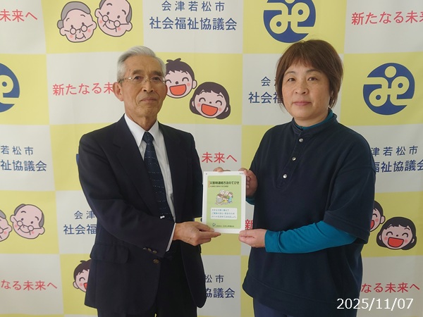 会津若松市社会福祉協議会(福島県)へ「災害時連絡方法のてびき」を贈呈 2025/11/07 2025年 地域の安全・安心への取り組み 東北 災害用伝言ダイヤル171等周知活動レポート 平成7年11月7日(金)福島支部では会津若松市社会福祉協議会へ「災害時連絡方法のてびき」を贈呈しました。 会津若松市は福島県の西部に位置しており、磐梯山や猪苗代湖など豊かな自然に囲まれた、自然景観に恵まれたまちです。 贈呈を受けた松本地域福祉課長様より「地域防災に役立つ冊子をいただきありがとうございました。防災イベント等での配布など有効に活用させていただきます。」とのコメントをいただきました。