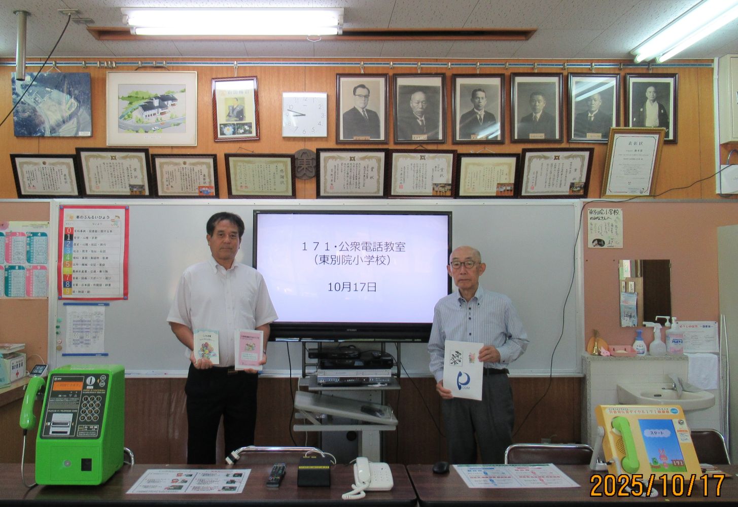 京都支部では、10月17日(金)、亀岡市立東別院小学校において171・公衆電話教室を開催しました。あわせて貝阿弥校長に「こども手帳」「ポケットマニュアル」等を贈呈しました。