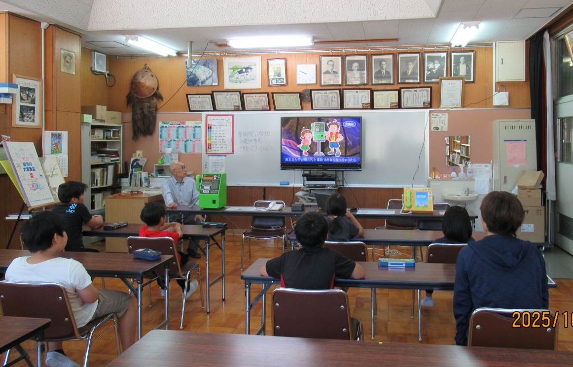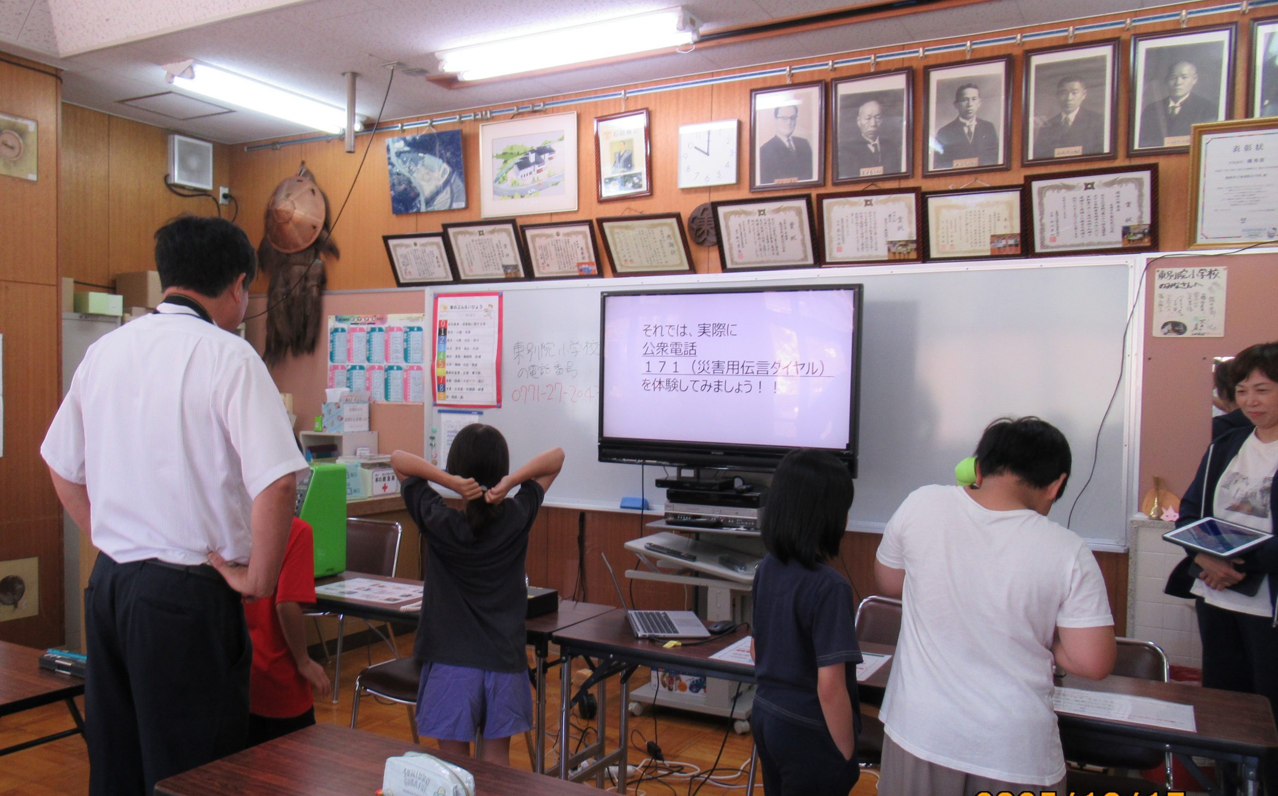 当日は、4年生の児童が、スライドやビデオ学習の後、公衆電話を使った緊急通報用電話(110・119)等の利用や体験機による171災害用伝言ダイヤルについて学習しました。