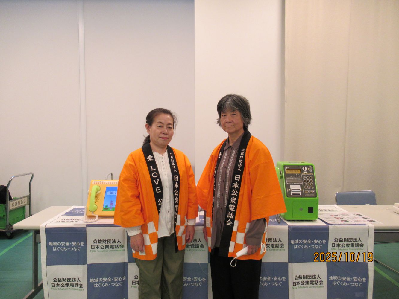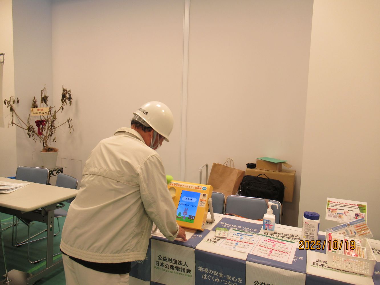 当日は、多くの東山区民が総合防災訓練に参加され、京都大学防災研究所 教授の講演や実践訓練が行われました。日本公衆電話会では、171訓練機・公衆電話を展示し、利用方法の体験や171の周知を行いました。