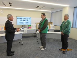 山口支部(支部長:関谷 博)では、3月6日(金)に山口市内の大学の外国人留学生のための生活用品・支援用品を山口留学生交流会に対して贈呈を行いました。本取り組みは、社会貢献活動の一環として毎年行っており今年で22回目を迎えました。贈呈した日用品はカレンダー、タオル、テレホンカード等で、昨年末から1月にかけて、会員やNTT西日本山口支店グループの社員・OBにもご協力をいただきながら収集したもので、当日は吉武理事から山口留学生交流会の中野会長にお渡しをいたしました。