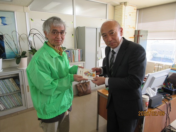 銚子市教育委員会にこども手帳を贈呈 2026/02/09 「こども手帳」の配布活動レポート 2026年 各支部の活動 災害用伝言ダイヤル171等周知活動レポート 行政の首長等への対応 関東 千葉支部では、令和8年2月9日(月)、東総地区の笠上副理事から銚子市教育委員会へ「こども手帳」と子ども向け災害用伝言ダイヤルサービス(171)のリーフレット300セットを贈呈しました。同教育委員会の中西教育長からは「毎年、こども手帳を寄贈いただき大変ありがたい。児童の安心・安全に役立てていきます」と力強いお礼のお言葉をいただきました。