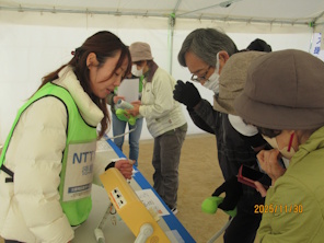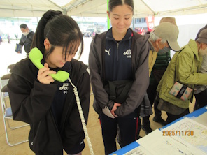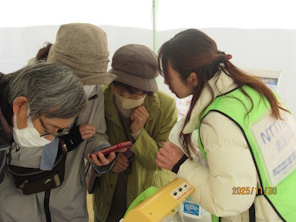 また、実施訓練・体験コーナーに設けられたNTTグループのブースにおいて、NTT西日本徳島支店と合同で、『災害用伝言ダイヤル”171”』の概要説明や伝言登録・再生などの実演教室を各地区ごとのグループ単位で行いました。参加者の皆さんは真剣に説明を聞いていただき、訓練当日は171サービスを提供していたため体験をして頂くように周知しました。公衆電話のかけ方(緊急時等)・公衆電話設置場所の検索方法についても説明を実施しました。また、訓練会場の城東小学校には特設公衆電話が(1回線)設置されていたためサポート活動も実施しました。