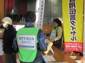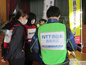 NTTグループのブースにおいて、NTT西日本徳島支店と連携をして もしものために体験しようと「災害用伝言ダイヤルの体験コーナー」を開設し、来場された多数の方が訪れ災害時の安否確認の使い方の啓発活動を実施しました。
