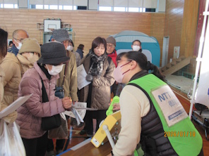 近年、大規模な自然災害が発生していることもあり、参加者の方々も防災意識が高まっているようで、今日の体験を家族や周辺の方と共有していきたいとのお話を伺いました。171をかけるのは初めての方がほとんどで、その使いかたや具体的な伝言内容について、パンフレット等で確認を行いながら実施しました。当日は、171サービスが提供されていたため自宅等で体験していただけるよう説明をしました。また、会場の体育館には、特設公衆電話が設置されており、サポート活動も実施しました。