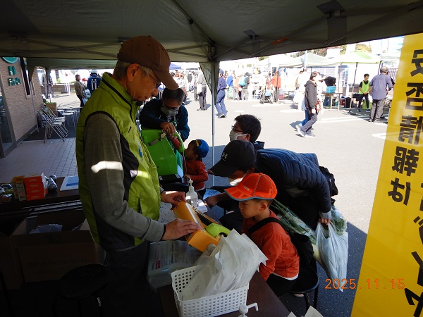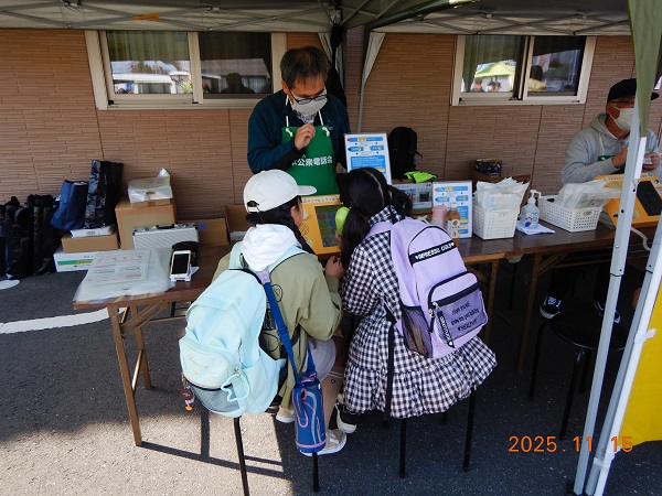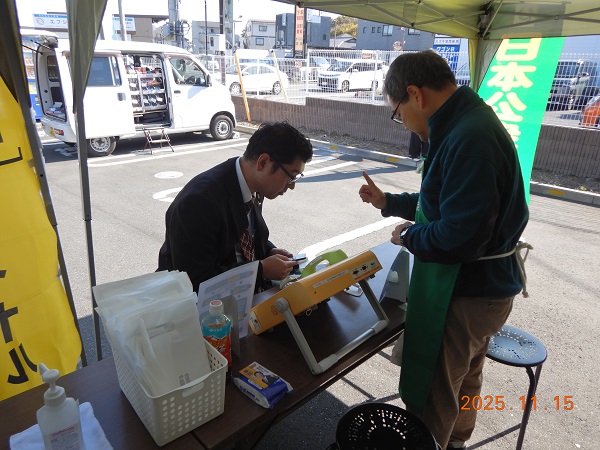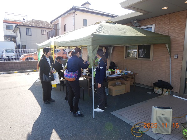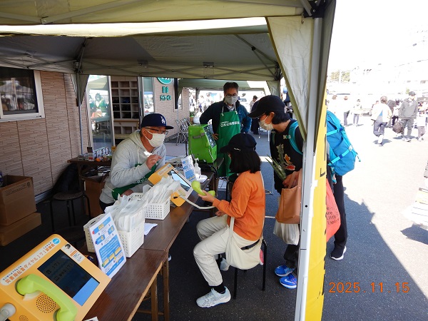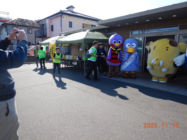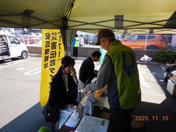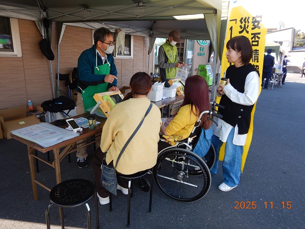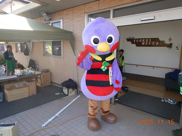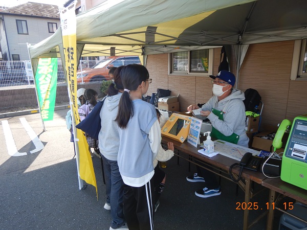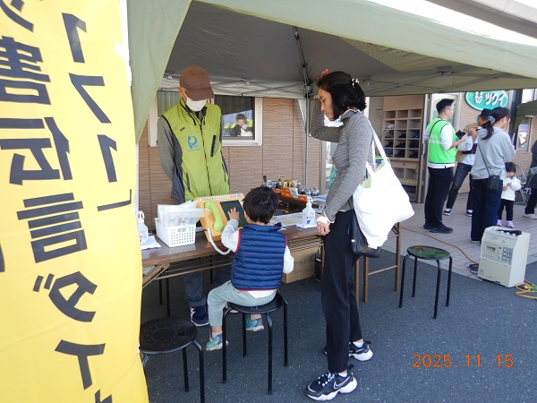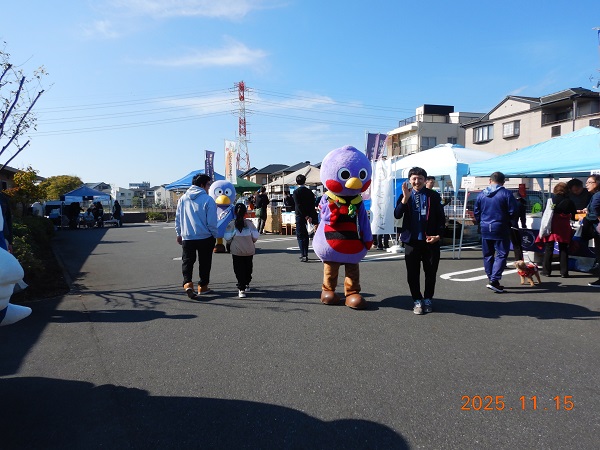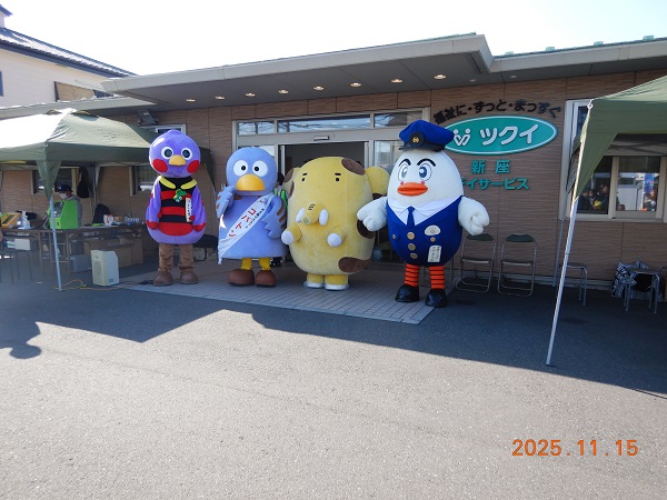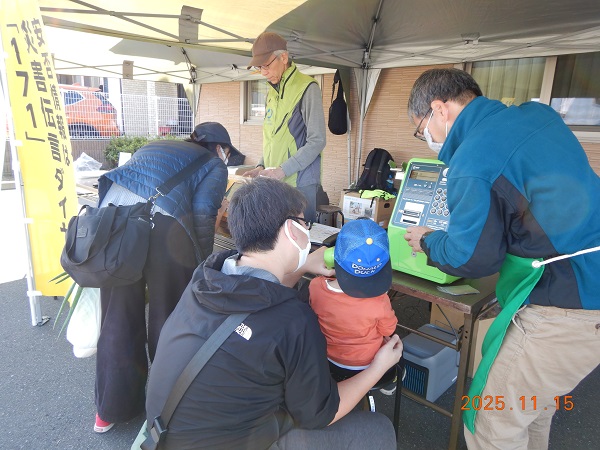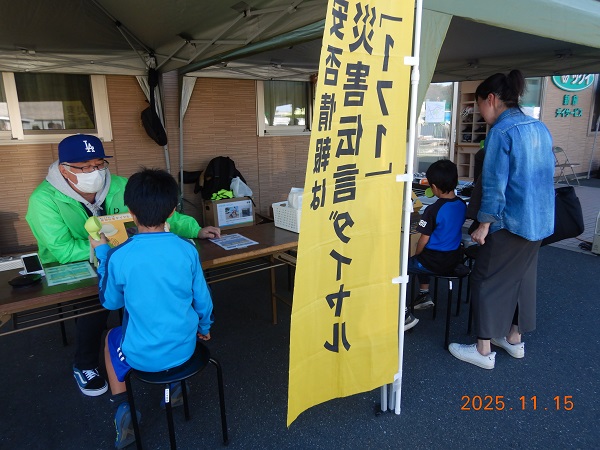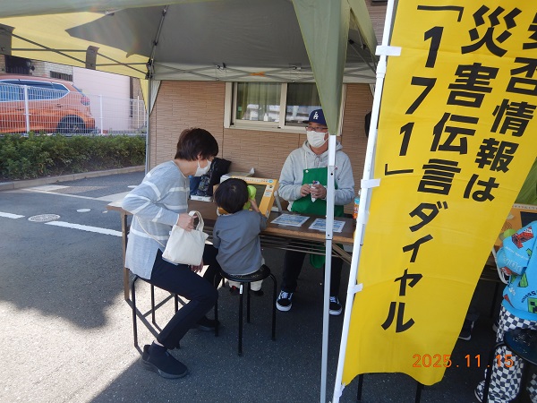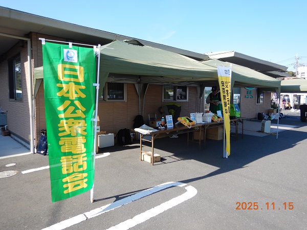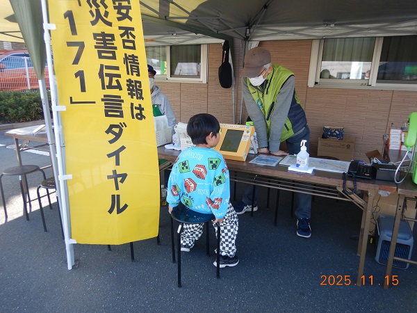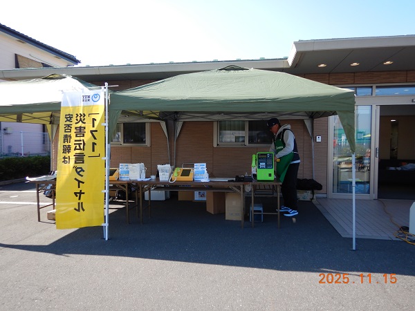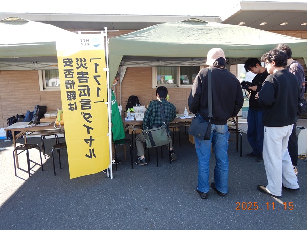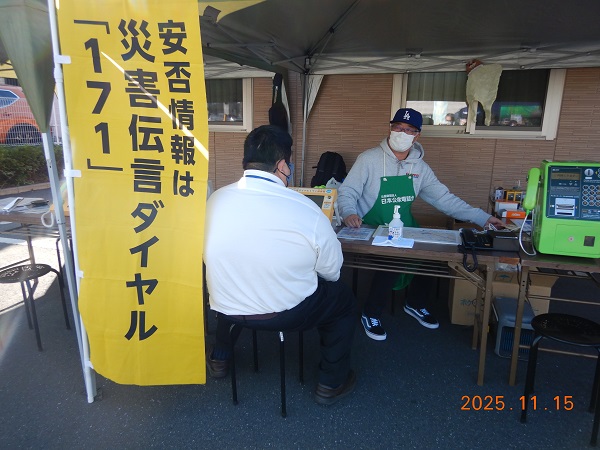 令和7年11月15日(土)、新座市ツクイ新座にて「第3回黒目川マルシェ」が行われ、埼玉支部ではNTT埼玉災害対策室と連携し「171体験教室」のメニューで参加しました。主催は、「地域住民及び施設長で構成された黒目川マルシェ実行委員会」で、新座警察による白バイ体験や日本公衆電話会の公衆電話操作や実際の171を使った体験等、実体験メインとしたプログラムや埼玉県、新座市、警察のゆるキャラ(ゾウキリン、コバトン、さいたまっち、ポッポくん)も登場し、来場者が楽しく体験ができるイベントでした。「171体験教室」では埼玉支部事務局等3名で公衆電話機、スマートホン1台、171ポータブル体験機(CUTE)2台を使用し実際の171サービスに録音いただき、帰宅後に家族皆さんで聞いていただき復習いただくプログラムを実施しました。小さなお子様を連れたご家族での参加が多く、お子様を中心に171サービスでの録音に参加されました。近年想定外に起こる各地の災害発生状況もあり、地域の防災意識も高く、100名の方が171サービスを体験されました。参加者からは、「171サービスの中身を初めて知り、貴重な経験だった。」「この先災害がいつ襲ってくるかわからない、防災を考える良い機会になった」「自宅に帰って家族みんなで171を使って復習してみる」等のお言葉もいただきました。